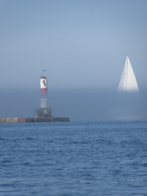 Sailboat coming into the break wall lots of fog.